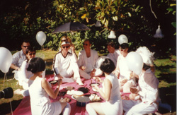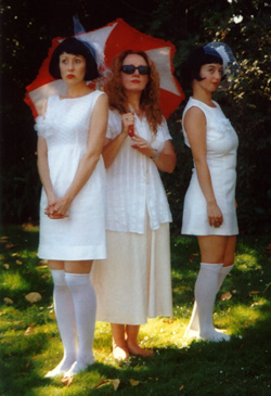 Clare Moore,twixt the Town Bikes, Carla at left and Gabi, at right. Picture taken by Phillipa Berry at a recent "Satie Party" in the Melbourne Botanical Gradens. The party was organized by the Town Bikes as a social/art event. ( Erik Satie apparently liked white stuff. Even the food at this shindig was all white.)