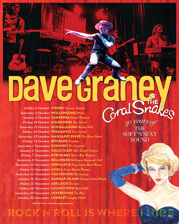 2018 Dave Graney memoir -WORKSHY - Cover art by Tony Mahony. Order it via Bandcamp here. Night Of The Wolverine available from July 2015 as an expanded edition at itunes- featuring seven of the original demos Dave Graney recorded on 4 track in 1991. There was a SPICKS AND SPECKS 90s special on ABC TV Feb 23rd 2019 featuring Dave Graney and the Coral Snakes in a special segment.